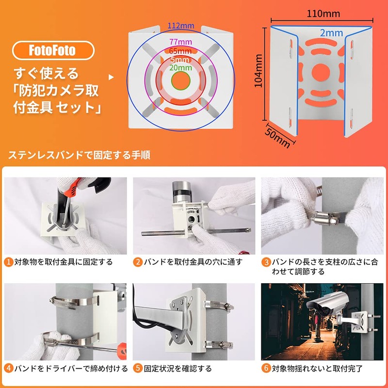 - (Ready to Use Security Camera Mounting Hardware Set) 1 camera bracket stand (mounting hardware) 4 stainless steel bands (size: 2 x 3.9 x 7.9 inches (10 x 2 x 20 x 2 pieces) 3) 8 sets of M4 bolts (M4 x 14 mm - 4 set) 4 sets of 2 security stickers (2 of each of each of 3 and 6 of 6) 1 Japanese instruction manual (English language not guaranteed). Compatible installation instructions (English language not guaranteed). Environment: Indoor/Room Provides external support