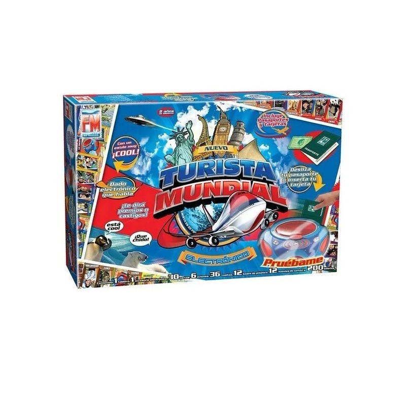 Gran diversión te espera con este Turista mundial electrónico de Fotorama para toda la familia. - El dado te dirá los premios o castigos - Podrás deslizar tu pasaporte o tarjeta - Ideal para pequeños de 8 años en adelante. Este juego de mesa incluye 1 tablero, 1 accesorio electrónico, 30 cartas, 6 aviones, 36 casitas, 12 bases de plástico, 12 hoteles de cartón y 200 billetes.