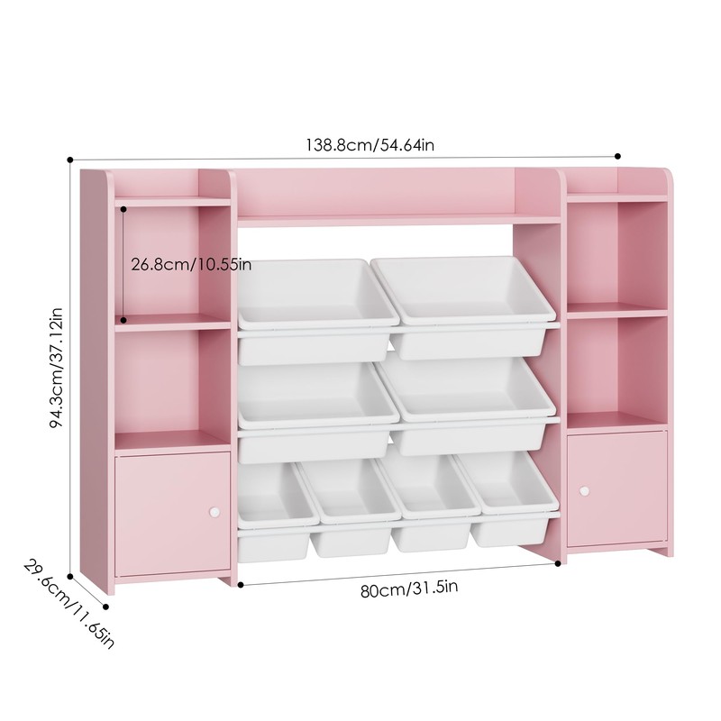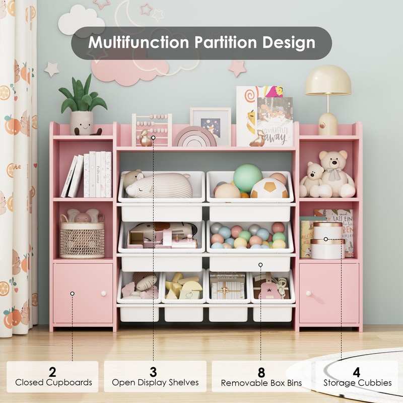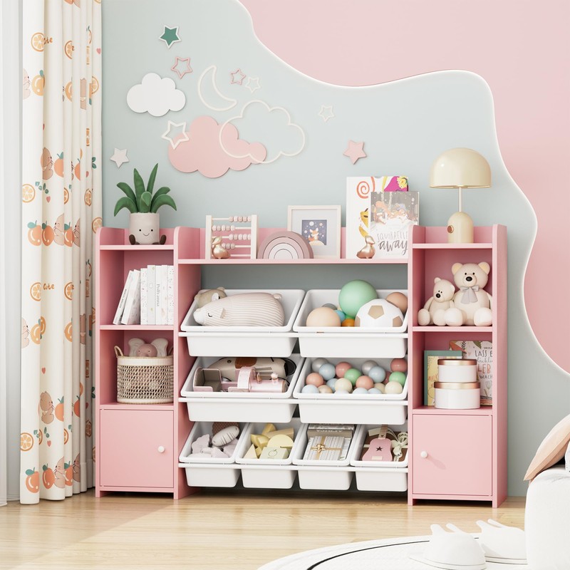FOTOSOK 55''Large Toy Storage Organizer with 8 Toy Bins, Toy Organizers and Storage with Shelf and 6 Storage Cubbies, Bookshelf for Kids, Playroom Organization and Storage Bins, Pink
