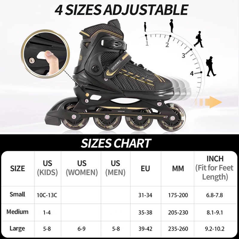 - 4 Sizes Adjustable ---The girls boys inline skates are adjustable in 4 sizes. You can adjust them to the perfect size at the push of a button, equally suitable for growing kids. (Don't forget to adjust the size before wearing them) .