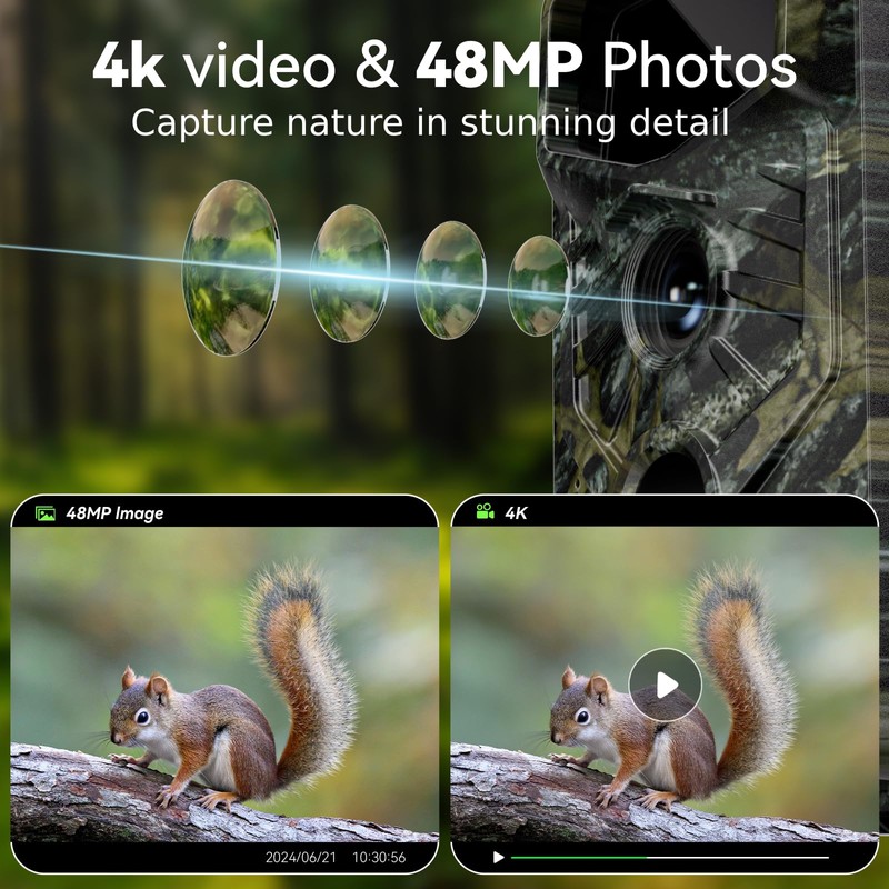 - Ultra-clear Photos and Videos: The Founissa trail camera captures 48MP images and 4K videos with sound. Equipped with advanced optics and 2Pcs high power low glow infrared LEDs, it delivers sharp, clear visuals day and night. The 2.0” HD TFT screen provides easy viewing.