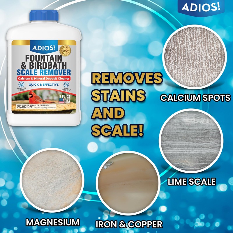 • TREATS LIME AND CALCIUM – Say goodbye to crusty calcium and lime deposits that can stain and discolor indoor and outdoor water fountains. Adios! Fountain Scale Remover breaks down mineral deposits