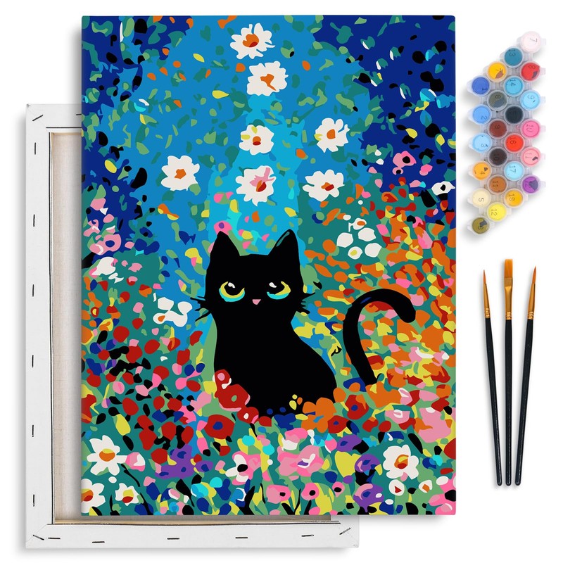 Fountor 12” W x 16”L Framed Paint by Numbers Kit for Adults Beginner, Black Cat Adult Paint by Number Kits on Canvas, Cat Flowers Oil Painting by Numbers for Home Decor Gift