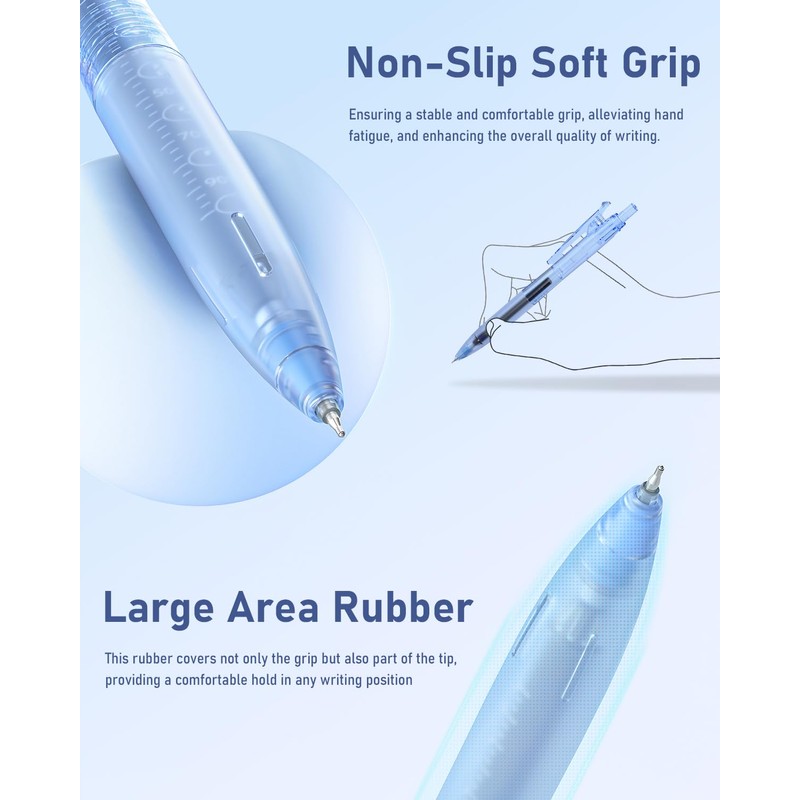 - [Comfortable Rubber Grip] These gel pens with soft ergonomic rubber grip are comfortable and not non-slip. It is easy to hold and reduces hand fatigue and improves writing control, especially during extended writing sessions, giving you good writing and drawing experiences.