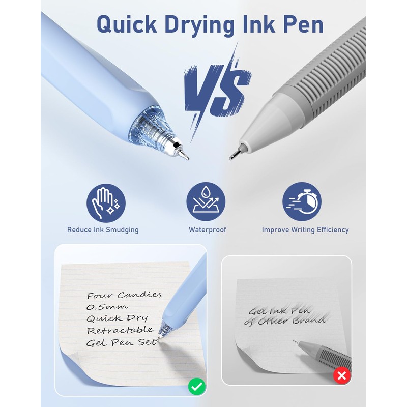 - [Premium Quick Drying Ink] 0.5mm retractable gel pens with quick-drying ink technology to prevent pollution or smearing and keep the paper clean. It is perfect for left-handed users or those who have the habit of demanding their hand when writing. Each nib is sealed with wax to prevent the ink from drying out. Note: The sealing wax must be removed before writing.