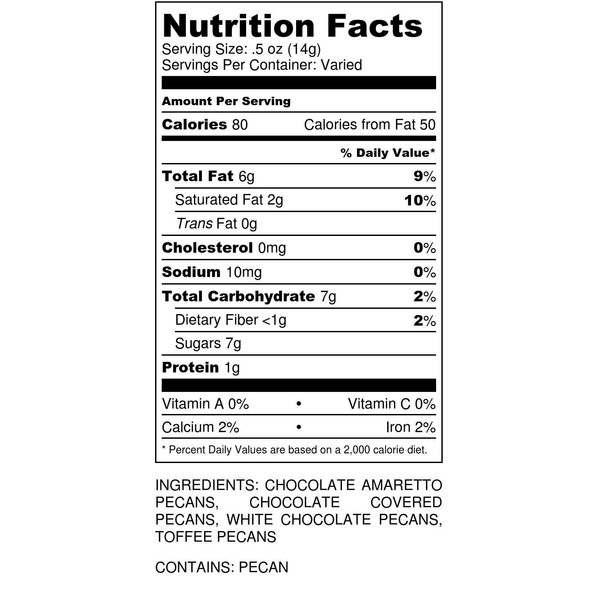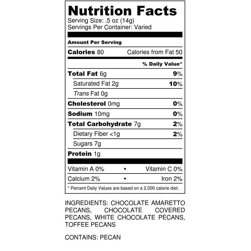 Ordering pecan gifts? This is a customer favorite! Our best selling gourmet chocolate pecans all combined into one gift tin. With the combination of Milk Chocolate Pecans, White Chocolate Pecans, Chocolate Amaretto Pecans, and Chocolate Toffee Pecans, this assortment is a crowd-pleaser. A perfect gift for chocolate lovers! Choose from a one pound or two pound gift tin. These gift tins are perfect for office gifts ideas and corporate gifts... or just a gift for her or a gift for him.