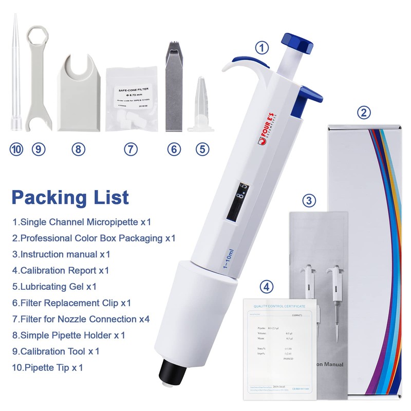 FOUR E'S SCIENTIFIC Single Channel Pipettor, Adjustable Variable Volume Micropipette High Accurate Pipettor for Laboratory (1-10ML)