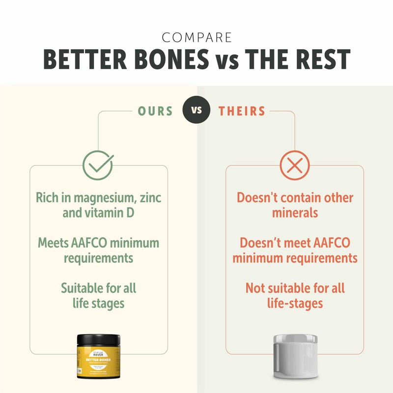 - Suited for Dogs of All Growth Stages: Many dogs struggle to eat whole bones. Better Bones is an excellent calcium powder for dogs suitable for seniors and puppies on a homemade diet. You don't need to worry about choking or splintering, and you don't need to add unnatural calcium to cooked foods. Best of all, it only takes a few seconds to mix the right amount of our air-dried bone powder into your pet's home-prepared meals.