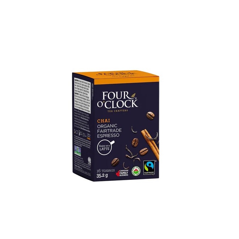 - The Best of Both Worlds: Why choose coffee and tea when you can have both? Four O'Clock Chai Organic Espresso Tea offers the best of both worlds—the invigorating caffeine kick of espresso combined with the soothing warmth and complex flavours. It's the perfect beverage for those moments when you need something special.
