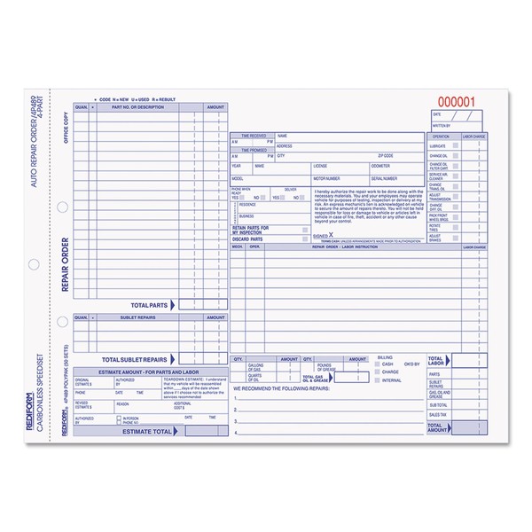 Four-Part Auto Repair Form, 11 x 8 1/2, Four-Part Carbonless, 50 Forms