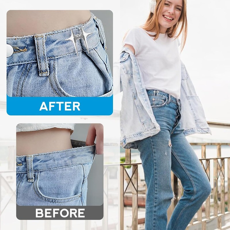 Elevate your wardrobe with the innovative **Four-Pointed Star Jeans Buttons Pins**, designed to provide a comfortable and adjustable fit for your jeans, skirts, and trousers. This set includes four pairs of waist tightener clips that effortlessly secure your waistband, allowing you to enjoy a tailored look without sacrificing comfort.