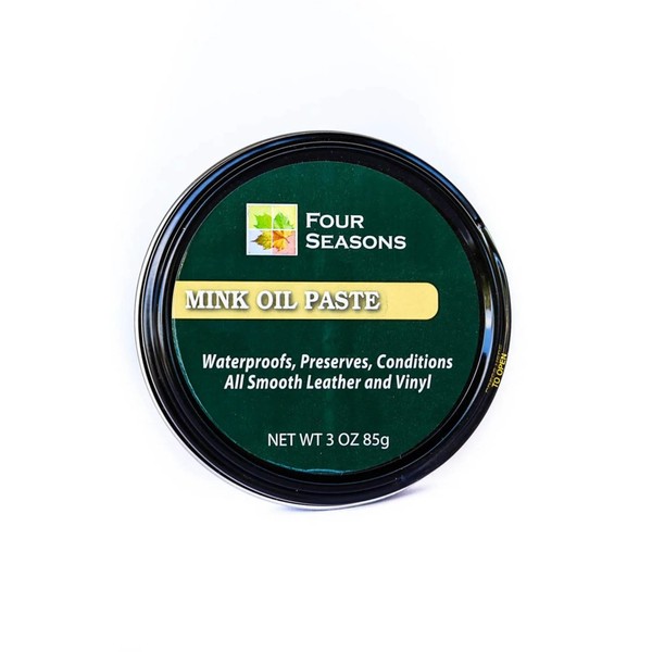 Four Seasons Mink Oil Paste waterproofs, preserves, and conditions. For use on smooth leathers and vinyl. Made is The U. S. A. Warning: not for use on suede or nu buck or brushed leathers!