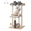 - Multi-functional kitty play tower: The cat condo boasts three 40" long scratching post, perfect for your cat to scratch, climb, play and exercise. Next to the scratching board is a cat self-groomer that provides gentle massage to keep your cat refreshed.