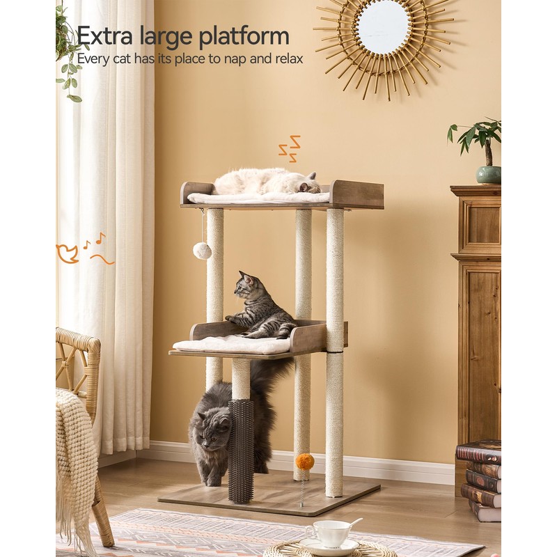 FourFurPets Modern Cat Tree for Large Cat, 43.7" Cat Tree Tower for Indoor Cats, Large Cat Tree with cat Scratching Post, Multi-Level Cat Condo with Self Groomer, Soft Perches, Greige
