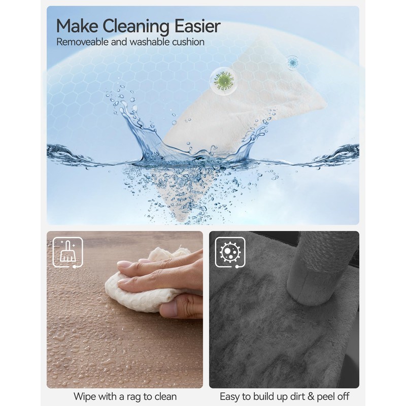 - More comfortable rest area: This big cat tower covered with soft cushions that are covered with 500g/sqm plush, making it easy to clean! These soft cushions are machine washable (you can also replace them with other colors and styles). If the framework and boards of the cat tree get dirty, a simple cloth can wipe away fur and dirt.