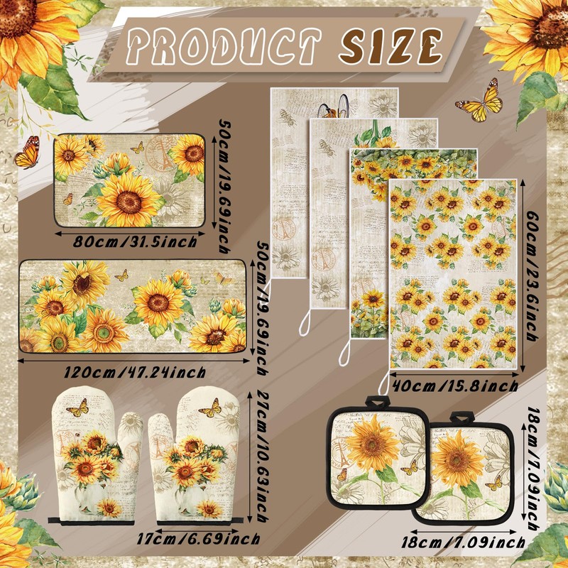 - Proper Size: the sunflower kitchen towels measure 15.75 x 23.62 inches, the sunflower rugs are 31.5 x 19.69 inches and 47.24 x 19.69 inches, the pot holders are 7.09 x 7.09 inches, and the oven mitts are 6.69 x 10.63 inches, fitting well in various kitchens