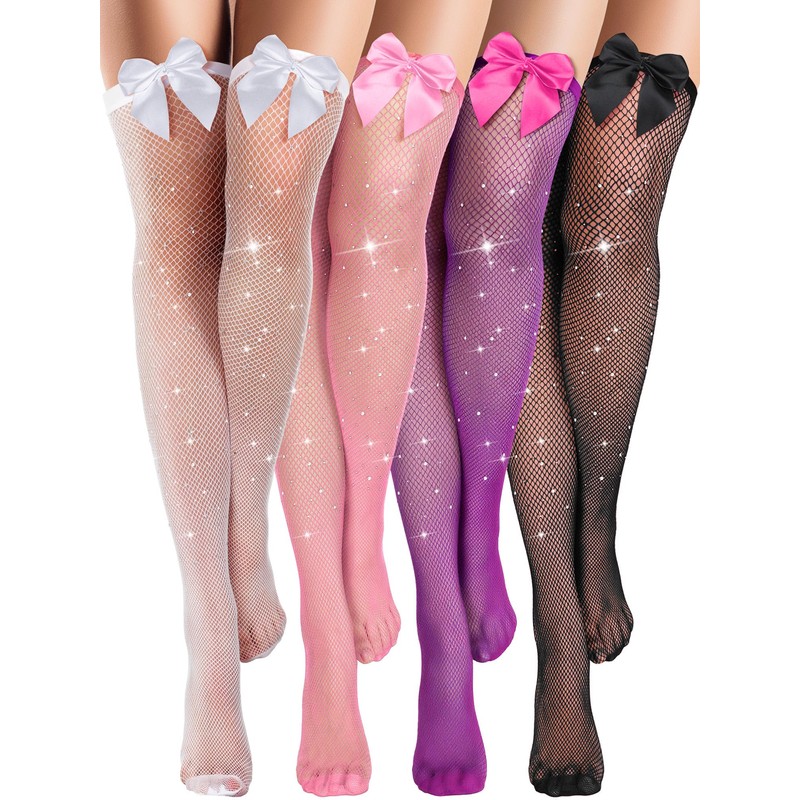 - Rhinestone Fishnet Tights with Bow: the fishnets stocking set comes with 4 pairs of glitter thigh high socks with bows, sufficient quantity, and rhinestone design for your wardrobe, sparkling and suitable for daily wear or replacement