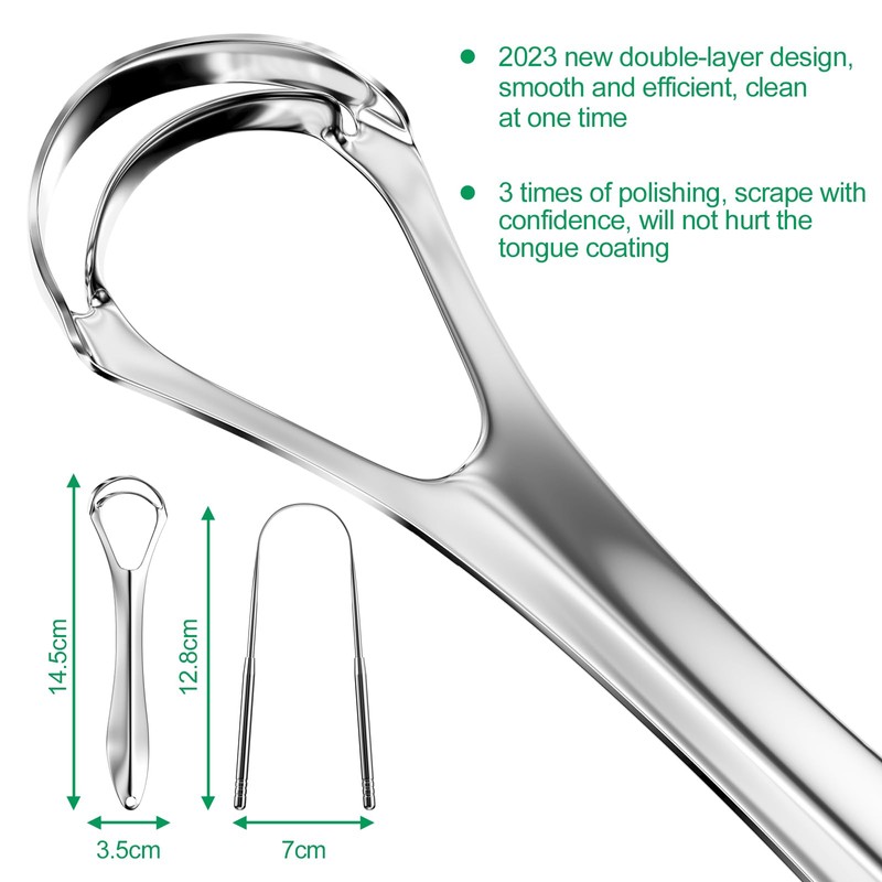 - Product specifications: The set contains two tongue cleaners, a wide head tongue scraper and a U-shaped tongue cleaner in two shapes, so you can better clean your mouth and provide fresh breath