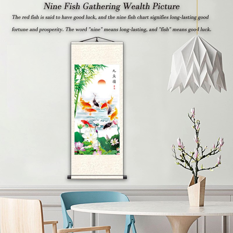 - ASIAN SCROLL WALL ART: Decorative painting structure is modern technology and traditional craftsmanship,our painting scroll has the feature of vivid pattern. The red fish is said to have good luck, and the nine fish chart signifies long-lasting good fortune and prosperity. The word "nine" means long-lasting, and "fish" means good luck.