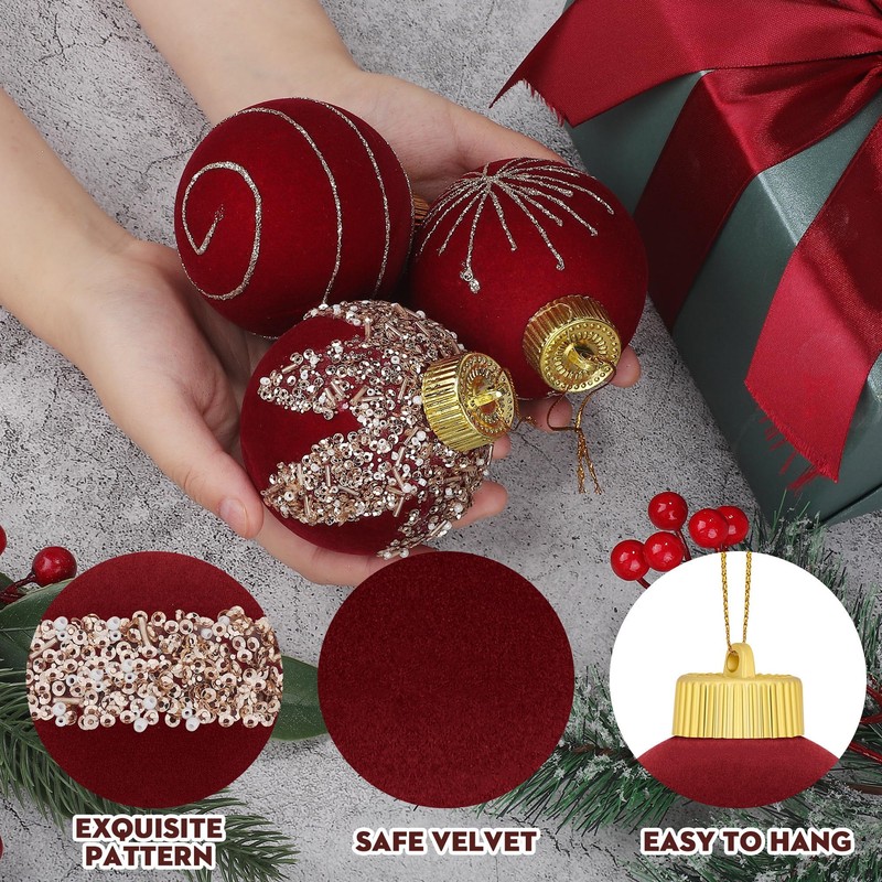 - High-Quality Ornaments: Crafted from premium foam and plastic materials, our velvet Christmas ornaments boast a flocked finish that resists fading, deformation, cracking, and wear. Enjoy the ease of handling and the peace of mind knowing these ornaments will enhance your holiday seasons for years to come. Their superior craftsmanship makes them a worthwhile addition to your festive decor collection.