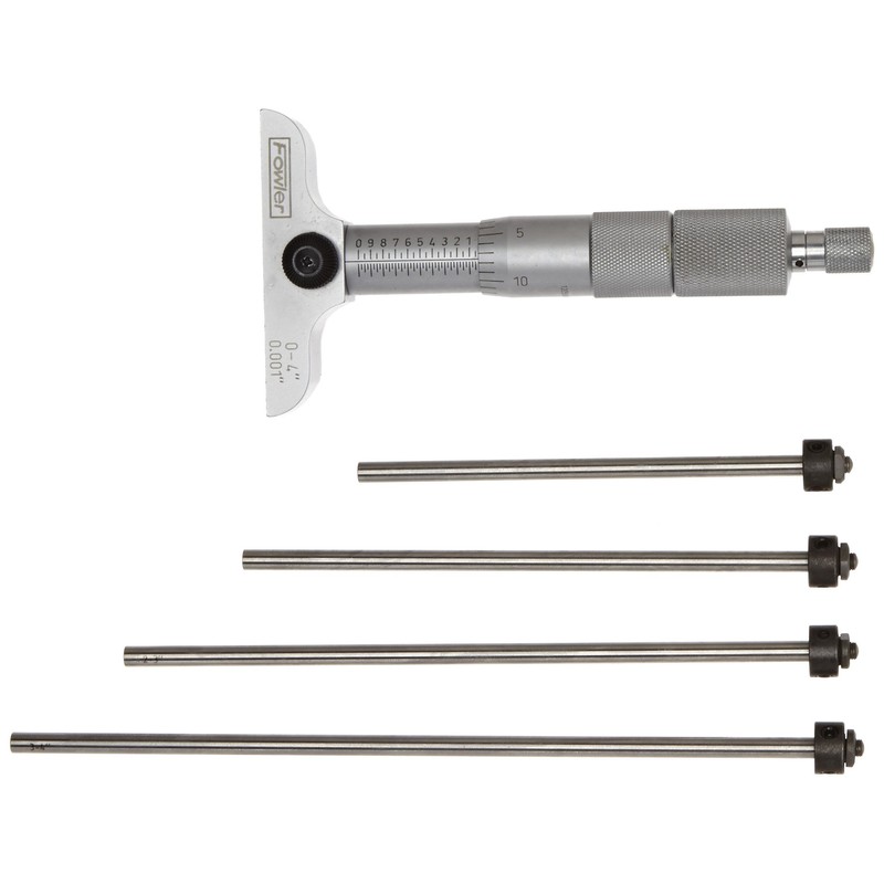 The Fowler Economy Depth Micrometers, depending on the model, have a measurement range of 0 to 4" or 0 to 6", a base of 2.5" or 4", and a resolution (or smallest graduation interval) of 0.001", with + or – 0.0002" of accuracy. The vernier scale provides precise measurements in fine units. Depending on the range of the model, the gauges include either or 0.176" diameter measuring rods. The units have a ratchet thimble and locking clamp for accuracy. The bases of the units are ground, hardened, and lapped for durability and accuracy. They have a satin chrome finish to reduce glare when reading measurements. They come with two wrenches and a hardened case. The gauges conform to Federal Accuracy specifications. Depth gauges are typically used in manufacturing, machining, and mechanical engineering. Comes with full one year warranty on material and workmanship. Contact Fowler, an American company, directly for warranty claims. Depth gauges are precision measuring instruments used to determine the depth of any shape that has a step, groove, or slot. These gauges often take the form of sliders that travel on a measuring beam or rods, are moved to position by hand, and then adjusted with a calibrated screw. The base of the gauge rests at the top of the shape whose recession is to be measured, while the beam or rods extend to the bottom of the recession to determine the measurement. Gauge position is read from a graduated scale, dial, counters, or an electronic display. Fowler manufactures inspection and measurement instruments such as electronic indicators, calipers, bore gages, and digital scales. The company, founded in 1946, is headquartered in Newton, MA.