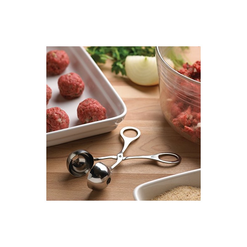 Tired of rolling and shaping meatballs by hand? Hate the sticky mess? Speed up the prep process and let the Meat Baller do the work for you. This handy gadget makes quick work of molding and forming ground meat into uniformly sized and shaped balls. Constructed of durable stainless steel, this meat baller features holes in the sides of the mold, so you can gently push out the formed ball. Also can be used as a fruit/melon baller, for measuring out cookie dough, shaping cake balls, preparing dumplings, or serving perfectly round balls of mashed potatoes! Creates 1.5" balls. Shape uniform meatballs for even cooking and attractive presentation.