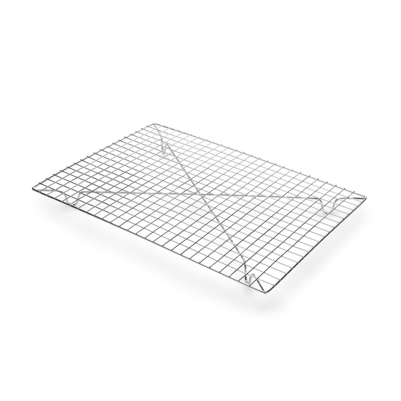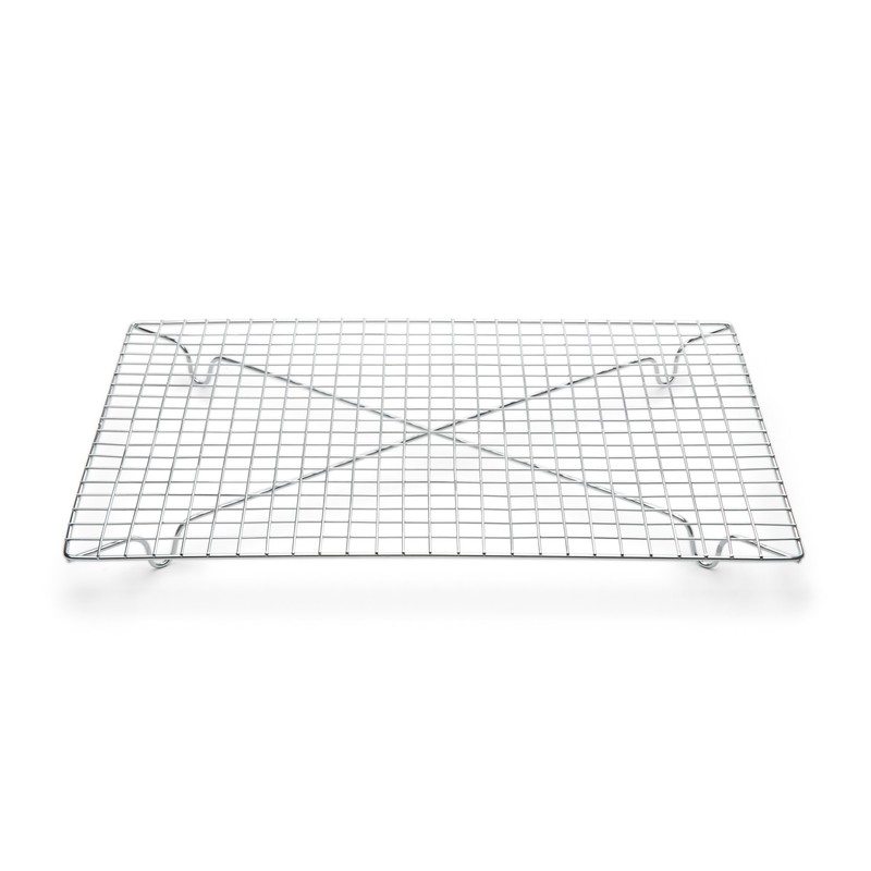 A baker's essential! End the baking process profoundly by placing your fresh- out-of-the-oven cookies, cakes, and breads on this Rectangular Cooling Rack. Made of durable, lightweight iron with a sleek chrome finish, the cooling grid elevates your baked goods for uniform cooling and nice, crisp undersides. It can also be used to keep hot pots and dishes off the table or countertop to avoid heat marks or stains. The rack's wires are set close enough together to support cakes and prevent cookies from slipping through. Its smaller size is perfect for kitchen's with limited counter or storage space. Don't end up with less-than-perfect baked goods due to poor cooling. A must-have for bakers everywhere.