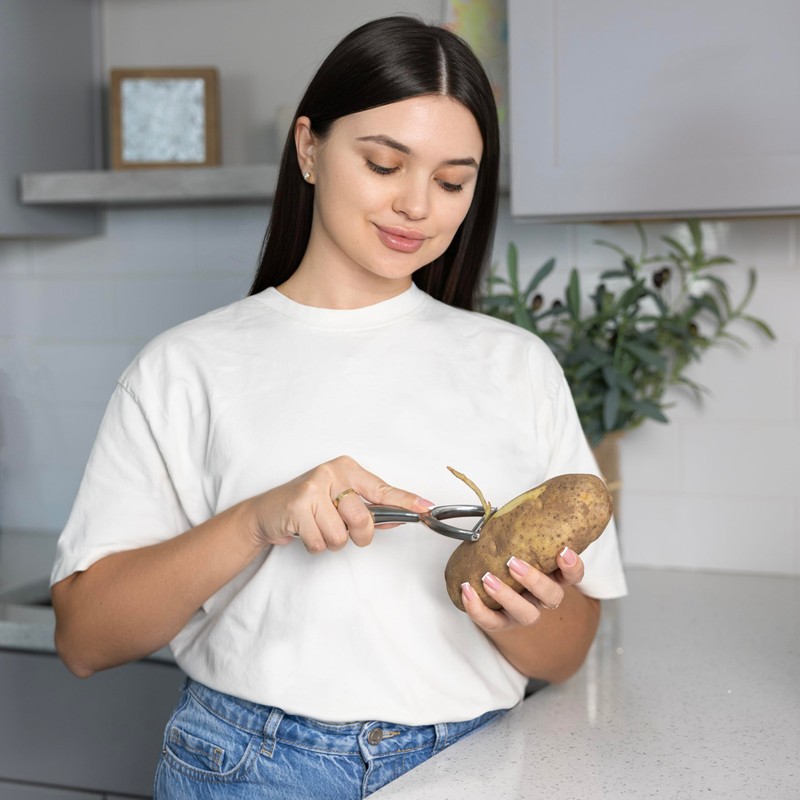 • DURABLE AND SHARP: Made of sleek and durable stainless steel this kitchen peeler efficiently removes the skin from vegetables and is built to last.