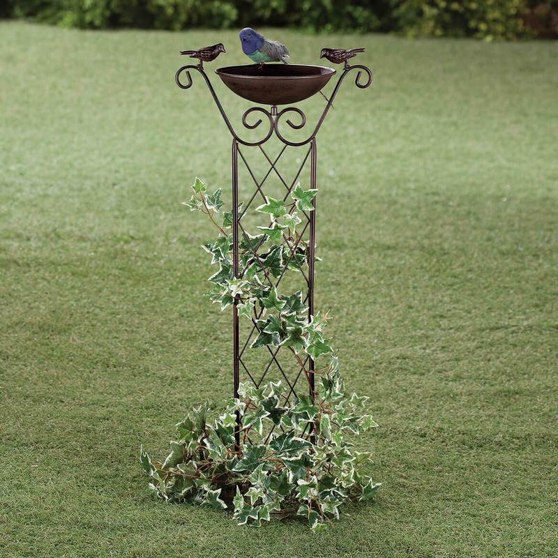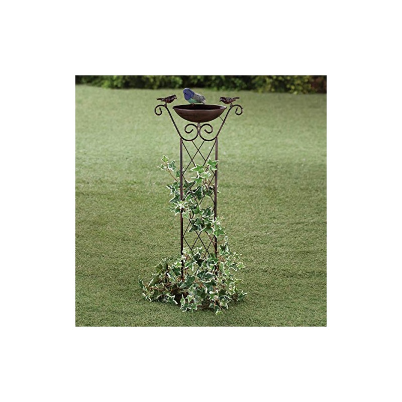 - Elegant Design: This bird bath, crafted from durable, weatherproof metal with a handsome bronze finish, features a trellis adorned with decorative birds and climbing flowers and vines, making it a beautiful addition to any garden or flower bed.