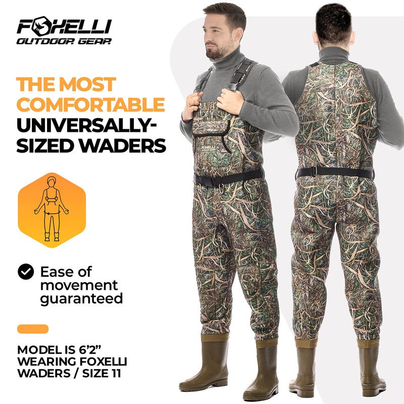 - CONSTRUCTED FOR COMFORT – Foxelli Fishing Waders with Boots are a breeze to put on and take off, and provide all the flexibility you’ll need while hunting or fishing. Chest suspenders have an adjustable elastic for finding the perfect fit, with quick release buckles that can be instantly detached. Double-layer knee pads have reinforced padding for added protection.