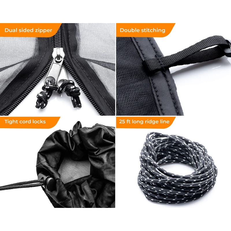 - SIMPLE SET UP: Foxelli Hammock Net comes complete with everything you’ll need to easily set up your hammock net cover in just seconds. An extra-long ridgeline is included (25 feet), as well as a convenient dual sided vertical zipper for easy in and out access, which are all must have accessories for any hammock camping set.