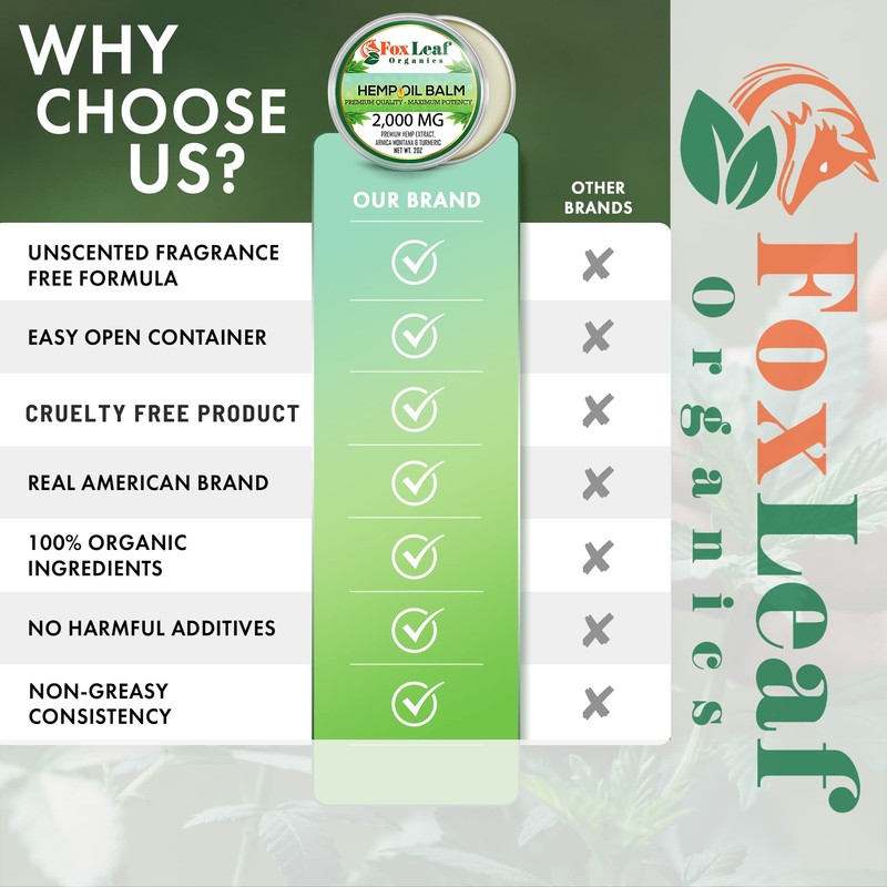 • Why FoxLeaf: We stand by the purity of our organic hemp oil balm. Unlike so many other brands offering false claims of millions or billions of MGs, at Foxleaf we believe integrity matters and that's why we offer 30-days guarantee to our customers