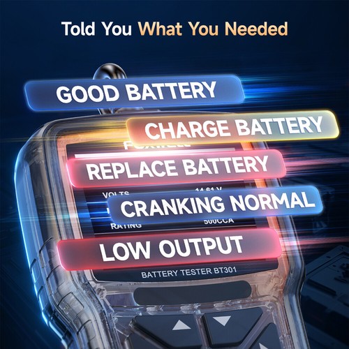 Check the health of your battery charging system to prevent overcharging or incomplete charging, which can damage your battery.  The tester indirectly evaluates the alternator's performance by analyzing battery voltage fluctuations.  Note: The BT301 does not directly test the alternator.