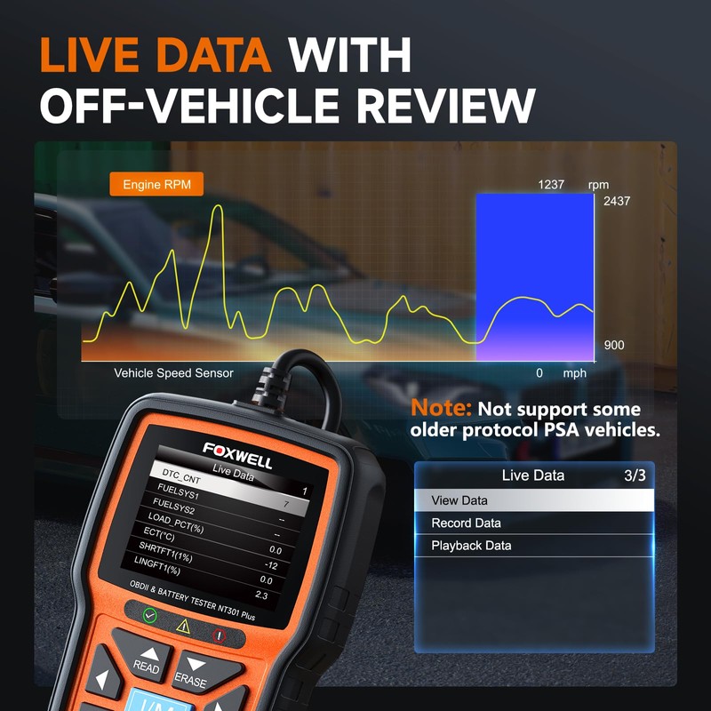 - Upgraded of FOXWELL NT301, More Features: 2-IN-1 OBDii SCANNER with 12V BATTERY TESTER. Combines full OBD2 functions with battery health testing, one NT301 Plus is enough. With visual and audible LED indicator, this car scanner will timely indicate the OBD2 monitor status