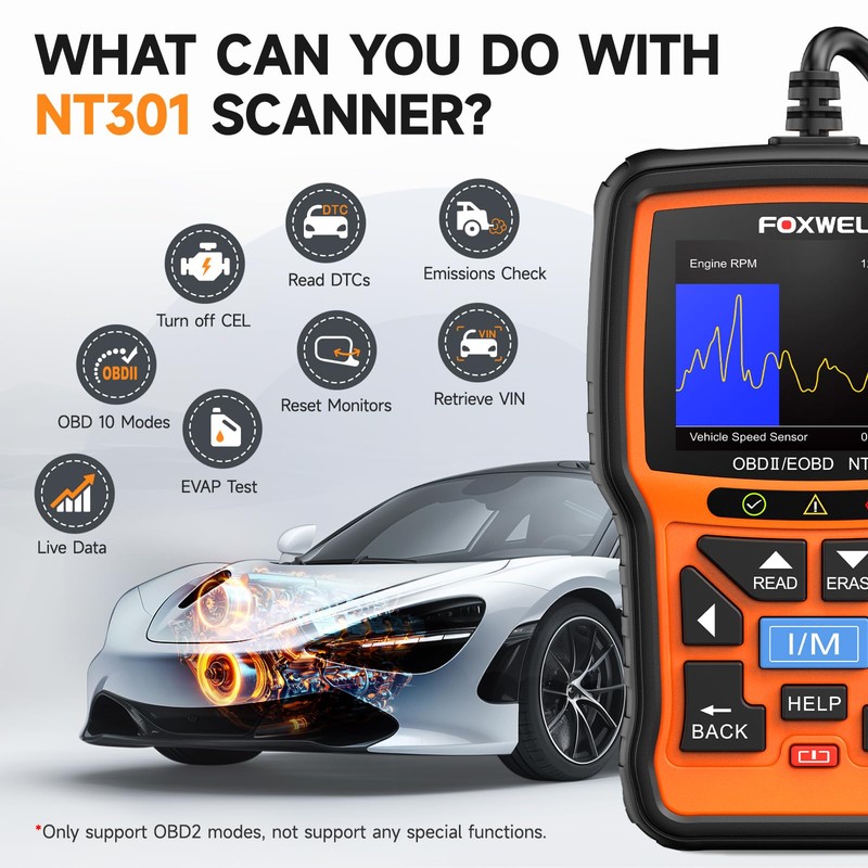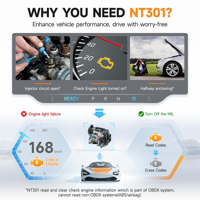 - [Vehicle CEL Doctor] The NT301 obd2 scanner enables you to read DTCs, access to e-missions readiness status, turn off CEL(check engine light) or MIL, reset monitor, read live data and retrieve VIN of your vehicle.
