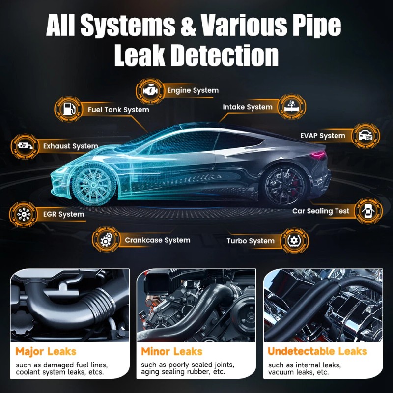 Smoke Mode: Smoke mode help you lacate the leak accuarately through the visible smoke. The smoke can be produced within seconds, dramatically reducing diagnostic time.