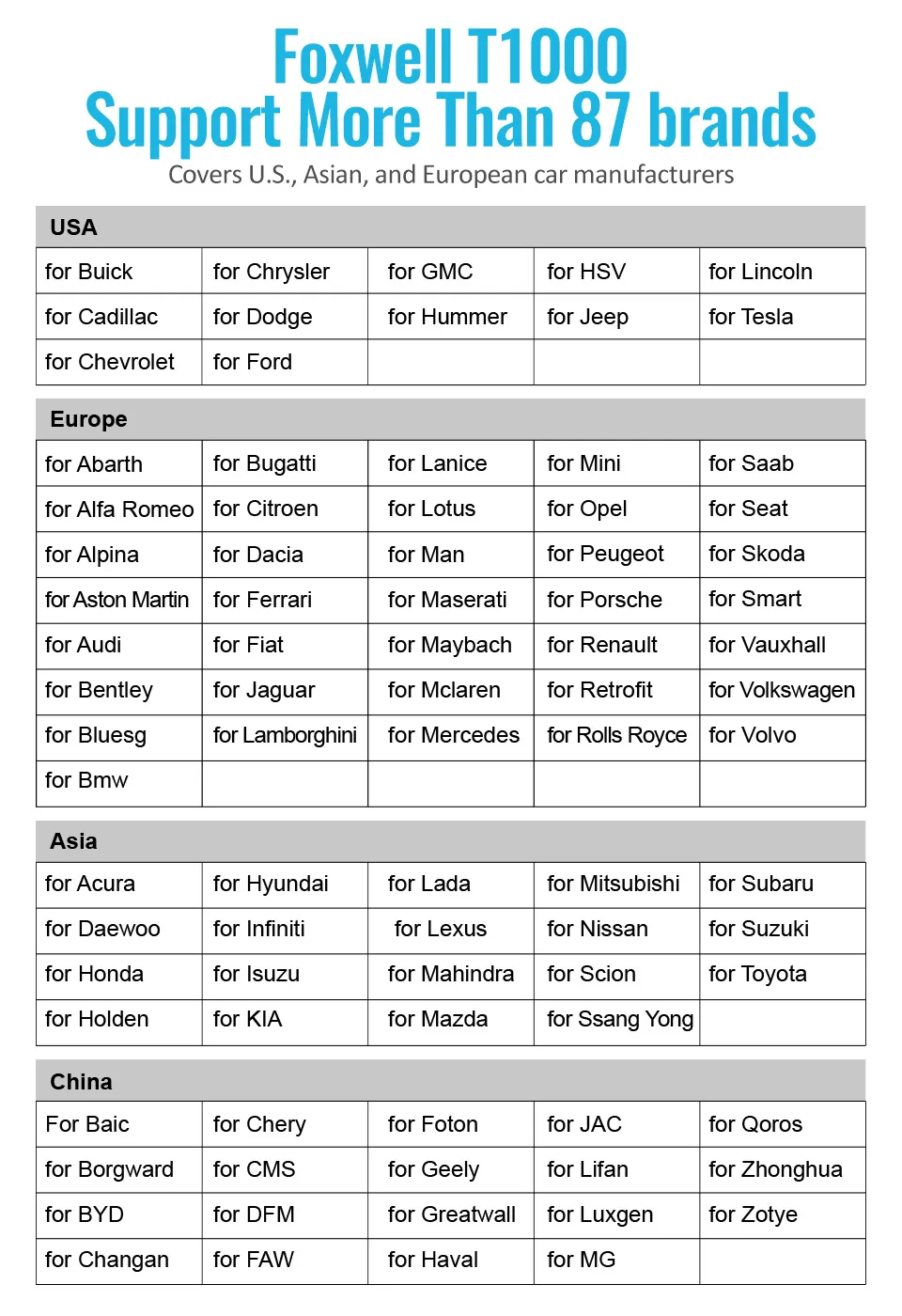 Foxwell's T1000 is an affordable universal TPMS service tool. It accurately activates and decodes TPMS sensors and program Foxwell self-developed T10 sensor. It is so easy that training is nearly not necessary as the whole process is displayed on-screen. Even the newest recruited technician can use the T1000 to complete his task. What is FOXWELL T1000? FOXWELL T1000 is 2021 new generation TPMS scanner to activate OEM/Universal TPMS sensors, retrieve TPMS sensor data (sensor ID,tire pressure, temperature, battery condition and OE part number), relearn 98% sensor IDs, program FOXWELL T10-sensor to replace bad sensors and testing RF Remote Keyless Entry Key Fob. Foxwell T1000 Features ●Able to Copy sensor ID and receive 315mhz 433mhz Sensor Activation Programming . (ONLY FOXWEL T10) Read TPMS Sensor Data Why is the TPMS light on? Weather if the tire air pressure are too low? Or is the sensor battery too weak? FOXWELL T1000 TPMS diagnostic tool can read the sensor ID, tire pressure, tire temperature, sensor battery, and frequency in seconds, help you figure out all TPMS problems fast. Programming FOXWELL TPMS Sensors Note: This TPMS programming function can only work with FOXWELL T10 sensor. 3 Methods for Quick TPMS Programming Copy by Activation Activate TPMS Sensors This FOXWELL TPMS scan tool T1000 enables you to activate 98% known OEM/Universal TPMS sensors in the market. You can rapidly and accurately trigger and decode sensors to read their ID, pressure, temperature, battery, frequency and OE Part number before servicing the tires/wheels or when you are performing programming or relearn. No need to purchase a separate activation tool. The sensor activation will be finished in seconds through two methods: in All wheel mode and in Single wheel mode. TPMS Sensor Activation 1. Highlight TPMS from the main menu and select the vehicle model as need FOXWELL T 1000 three types of TPMS sensor relearn self learning Key FOB Testing (315/433MHz) FOXWELL T1000 provides the key fob testing, which can precisely test the 315MHz or 433MHz key fobs to ensure whether it is perfectly running, being super easy for users to identify the key fob condition with the loud and clear audio and visual indication. Foxwell T1000 Support Language English,French,Spanish,Germany,Italian,Portuguese(NEW) TPMS Sensor Activation Instruction 1.Highlight TPMS from the Main Menu and Y press the YES key to start. Foxwell T1000 Support More Than 87 brands Lifetime Free Update via USB Cable Package List 1*T1000 Main Unit |
