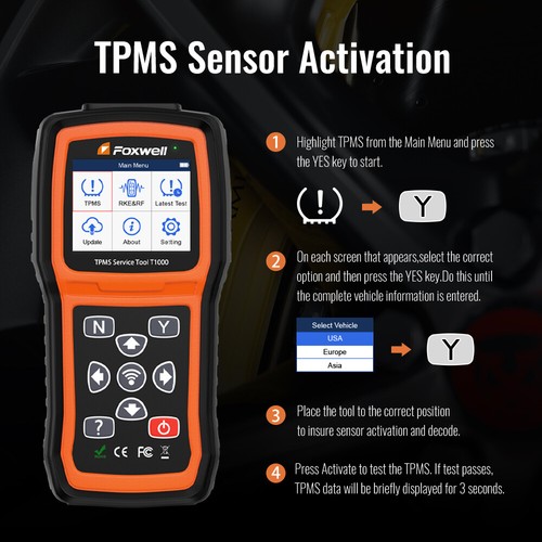 FOXWELL T1000- Professional TPMS Relearn Tool with sensor activation and programming-It's new generation FOXWELL TPMS service tool to activate OEM/Universal TPMS sensors, retrieve TPMS sensor data (sensor ID,tire pressure, temperature, battery condition and OE part number), relearn 98% sensor IDs, program FOXWELL T10-sensor to replace bad sensors and testing RF Remote Keyless Entry Key Fob.