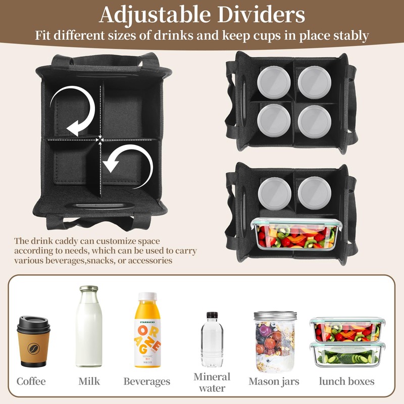 - Extremely Strong Stability This drink carrier for delivery is equipped with adjustable dividers to accommodate different cup sizes, providing protection and heat insulation to prevent cup damage from collision, as well as beverage spillage or overflow. The edges and bottom are made of PP partitions, offering superior support and protection. Make sure your coffee carrier remains stable even when encountering bumpy or crowded conditions on the road.