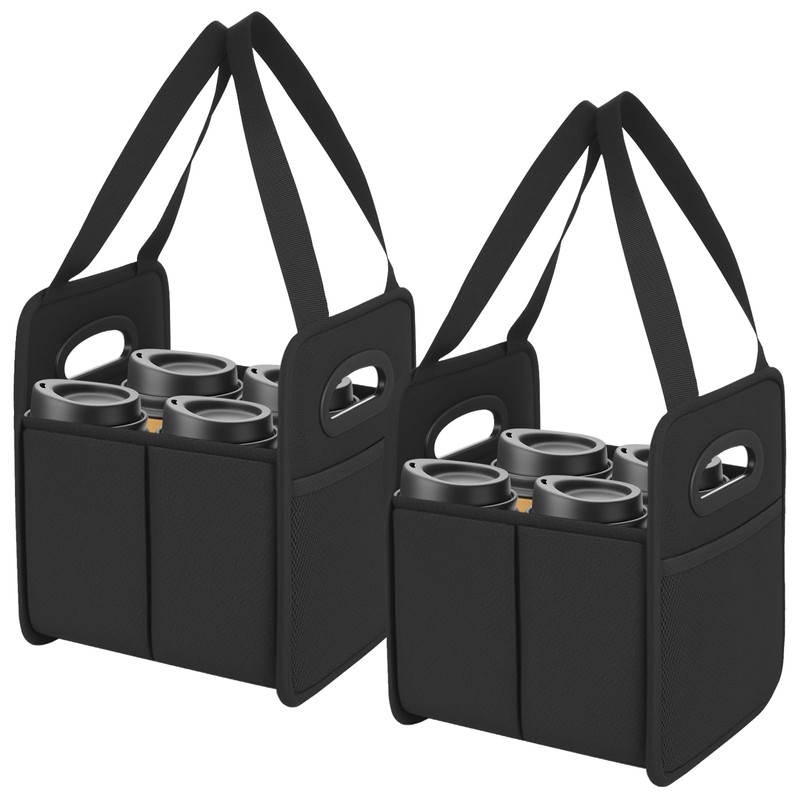 - Thoughtful Pocket Design The sides of the portable drink carrier feature extra grid semi-transparent storage pockets. You can put in small items such as straws, snacks, candy packets, tissues, keys, mobile phones, cards, etc., making it effortless for you to find what you need. The drink bags are foldable to save space. When not in use, it can be easily stored in the trunk of a car, kitchen cabinet or food cabinet to keep it tidy.