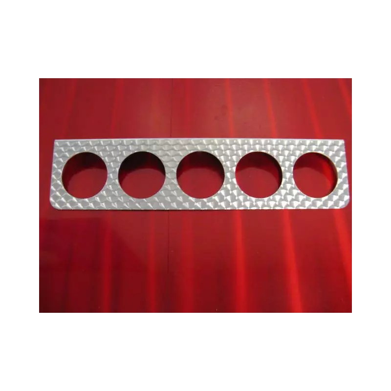 Universal 5 hole under-mount gauge panel made from .063 aluminum with 5 holes for 2 1/16" diameter gauges, not included. The panel is 3" tall and 13" wide with 1" lip and screw holes to mount to the underside of the dash. Beautiful engine turned finish using 1/2" diameter swirl pattern. Great eye candy for any street rod or muscle car. Proudly made in the USA by FPM Metals of Fairbury, Nebraska a supplier of engine turned materials for the automotive enthusiast. FPM Metals can also custom fabricate dash and firewalls from its engine turned metals for information call 4027292264 or visit our company fpmmetals on net