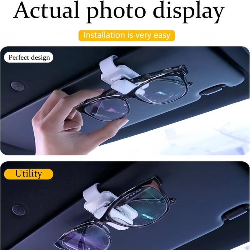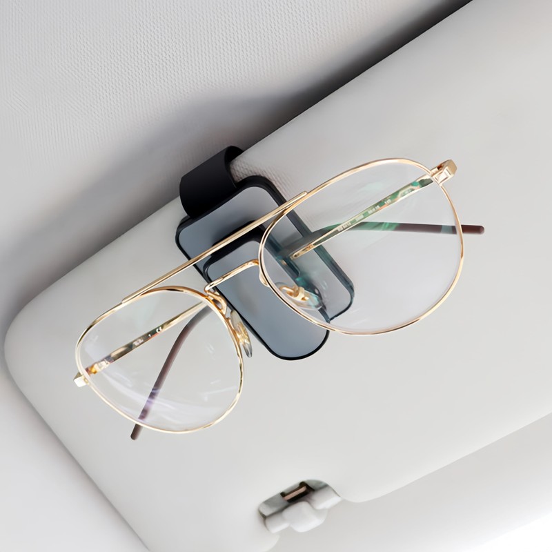 Product Features. This car visor sunglasses clip you will receive is made of high quality plastic, humanized design, the car sunglasses clip can hold different sizes of sunglasses, allowing you to adjust your glasses vertically or horizontally, the car visor sunglasses clip is easy to use and within reach, it can provide extra storage space for your car. Specification Color: Black Size: as shown in the picture