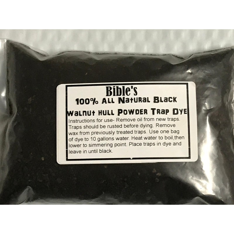 - Bible's 100% ALL NATURAL BLACK WALNUT HULL POWDER TRAP DYE Instructions for use - Remove oil from new traps. Traps should be rusted before dying. Remove wax from previously treated traps, Use one bag of dye to 10 gallons water. Heat