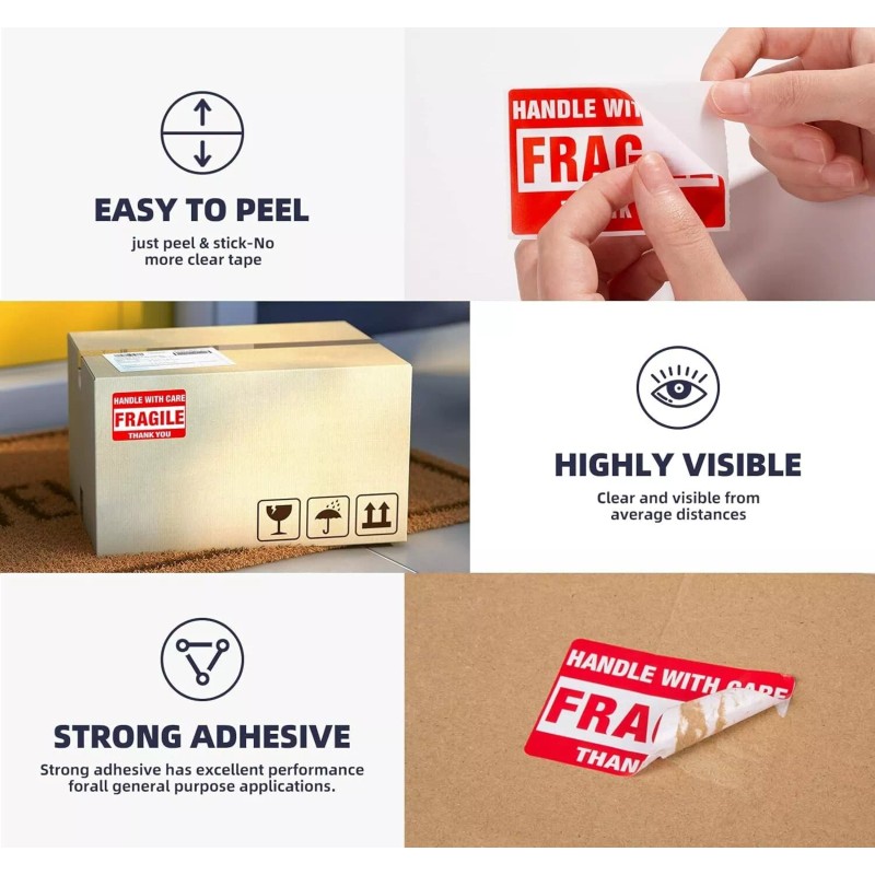 - EASY TO USE: Fragile Packing Stickers have strong permanent adhesive hold fast to poly bags, boxes, bubble wrap, shrink wrap and pallets. Just peal it off itâs backing and apply!