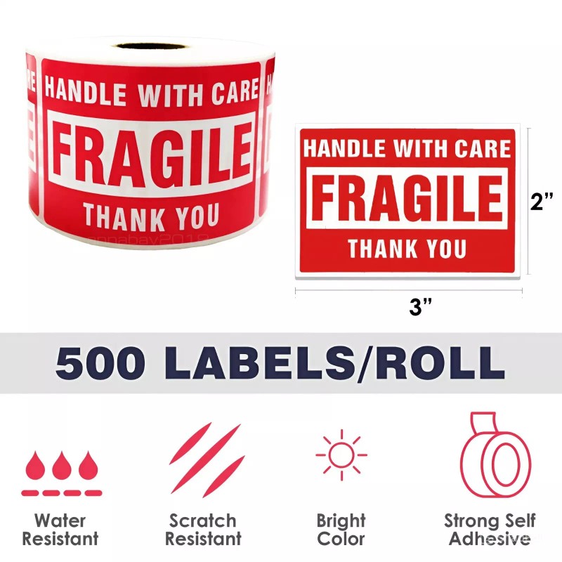 - PERFECT SIZE FRAGILE STICKERS: Total 500 fragile stickers for shipping, each is 2 x 3 inch. This size is ideal for getting carriersâ attention to take care with your breakable items. The Package contains 1 roll/500 labels, enough to meet your daily requirement.