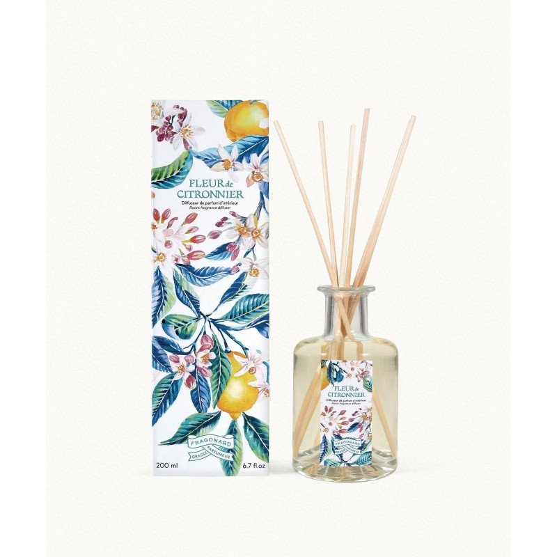 • Fragonard Fleur de Citronnier (Lemon Blossom) diffuser subtly fragrances your home, releasing delicate floral and citrusy notes into the air, both fresh and comforting. A luminous fragrance carried by the zesty note of petitgrain and the effervescence of Italian lemon, rounded out by Brazilian orange, the nobility of jasmine, and amber.