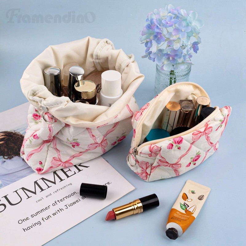 Framendino, 2 Pack Bow Flower Travel Makeup Toiletry Bag Set for Women Cotton Pink, Pink, 2 Pack