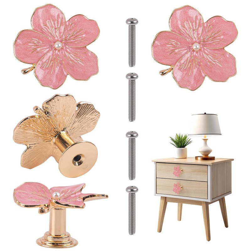 Framendino, 4 Pack Pink Flower Metal Cabinet Knobs Petal Drawer Dresser Handles for Kitchen Wardrobe Door Pull