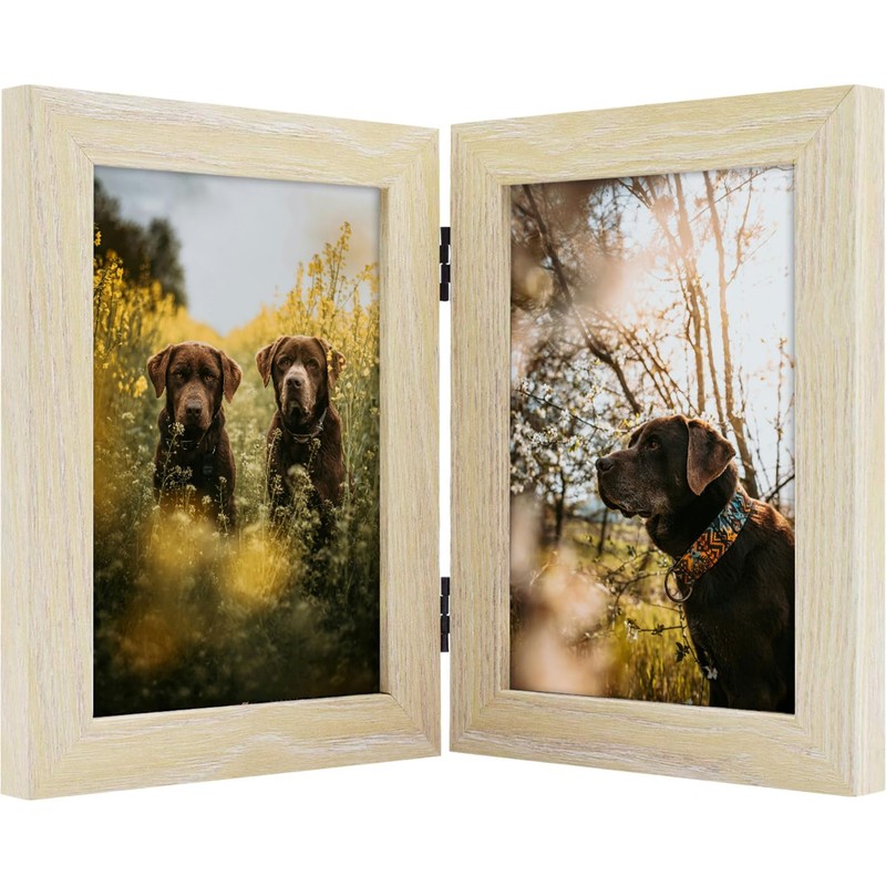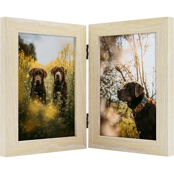 Frametory, 5x7 Double Picture Frame Hinged 2 Photos Frame Collage, Desk Picture Frame with Glass, Side by Side Frame Vertical (Natural, 1 Pack)