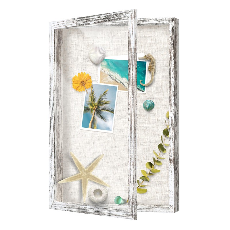 FrameWorks 12x18 Deep Shadow Box Frame, Wooden Display Case w. Linen Board & Tempered Glass Door - Distressed White - Large - Wall Mounted